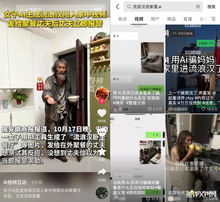 这阵子,网上又流行起了用 AI 生成“流浪汉闯入进家”的图片视频去整蛊自己的家人,很多人都上当,甚至还报了警。。。