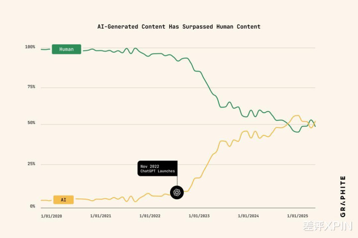 内容分析平台 Graphite 曾发布过一项数据,早在 2024 年 11 月,网络上 AI 生成的文章数量就超过了人类撰写的文章。