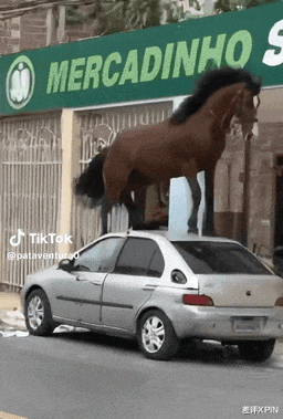 一匹失控的马在路上横冲直撞,先是踩碎了汽车玻璃,接着又撞坏了门板。